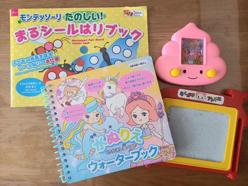 我が家はタブレットを持っていないため、100均の簡単なおもちゃやその場で楽しめるゲームなどを駆使して毎回乗り切っています。